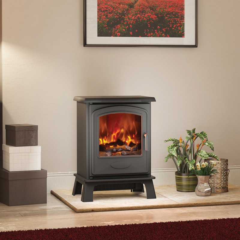 The traditional Be Modern Flare Ora 5 Electric Stove, fully remote control, freestanding electric stove boasts a gentle arched window set into a Cast Iron door with Steel body, finished in Matt Black, with its realistic glowing log bed that shimmers beneath the stunning dancing flames.