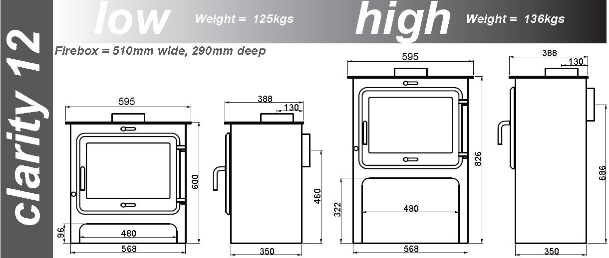 Ekol Clarity 12 Multifuel Stove overall dimensions: