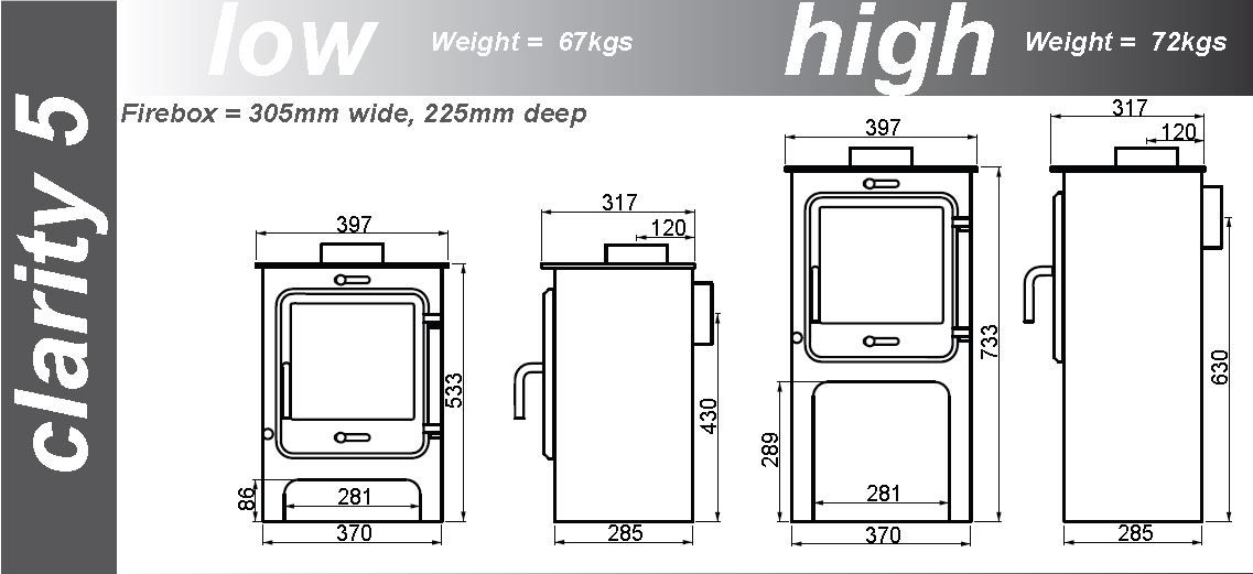 Ekol Clarity 5 High Multifuel Stove overall dimensions: