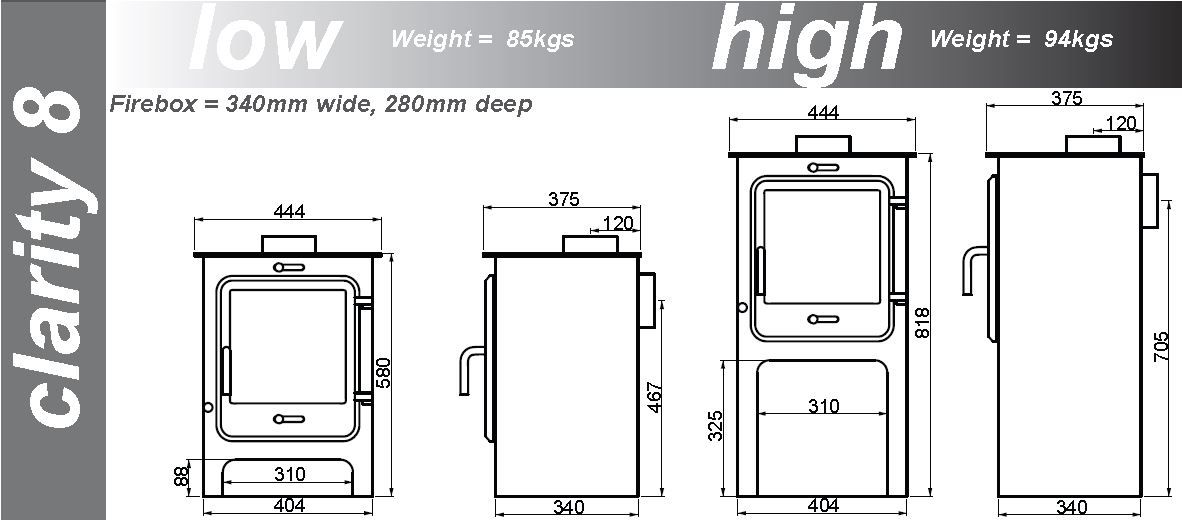 Ekol Clarity 8 High Multifuel Stove overall dimensions: