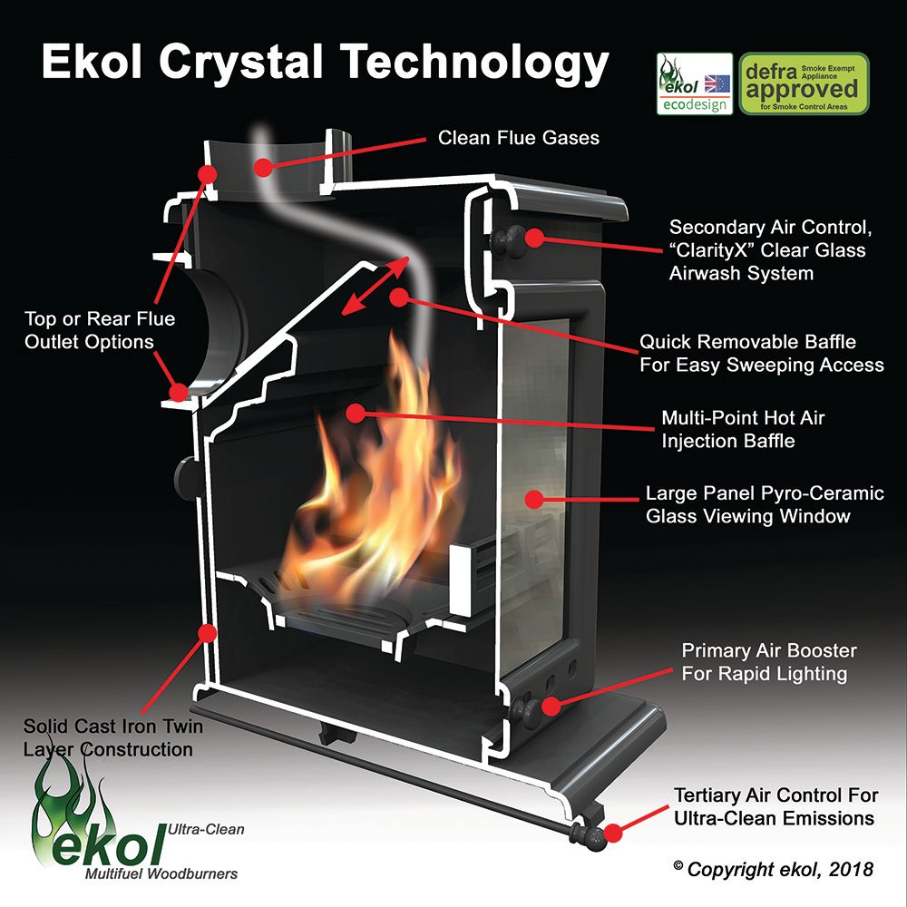 The Ekol Crystal 5 Multifuel Stove is, along with the Clarity 5, one of the few stoves in the UK capable of being installed into a standard 16” wide fireplace opening.